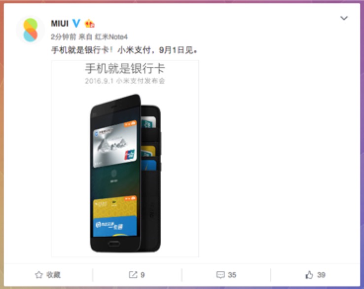 8月30日,小米官方微博“MIUI”发布消息称,9月1日小米将举行发布会,与中国银联共同推出“小米支付”(MI Pay)。这意味着小米正式进入手机NFC支付领域。