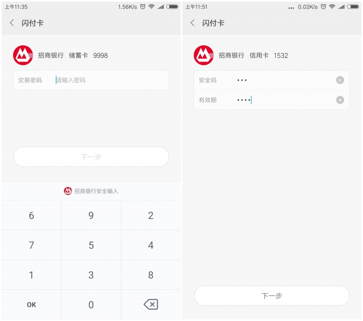 输入卡号之后,下一步是输入交易密码(银行卡的取款密码)。信用卡则需输入安全码和有效期,确认无误之后点击下一步。