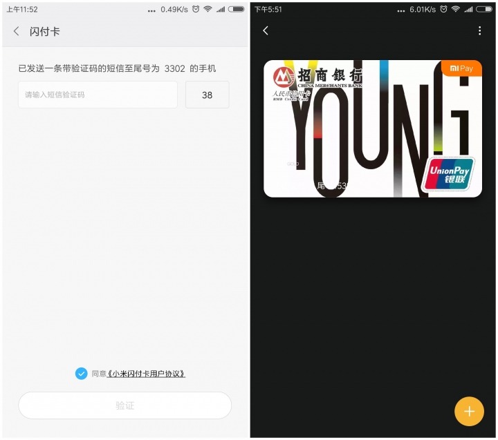 最后你会收到一条验证码。确认后,卡片将自动安装,安装时间大概持续几分钟。安装成功后,将会跳转到你的银行卡页面。卡片右上角有MI Pay标志,说明这张卡可以直接用MI Pay刷闪付了。