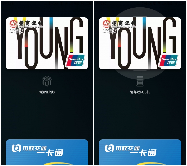 2.在收银员设置好POS之后,将手机靠近POS的感应区,手机上会自动弹出MI Pay页面。选择需要使用的银行卡,根据提示验证指纹之后即可靠近POS刷卡。