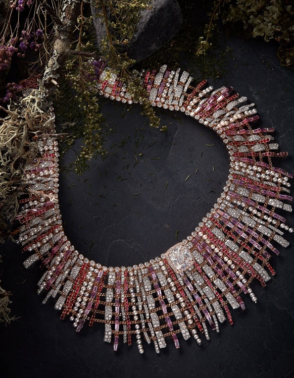 除了提高相关领域的专业性,Chanel 在时装领域所积累的工艺为品牌的珠宝创作提供了不竭的灵感源泉。2020年,Chanel 推出 Tweed de Chanel 高级珠宝系列,设计灵感正是源自品牌的斜纹软呢(tweed)面料。“许多公司想要用珠宝来表现面料质感,但只有我们的工艺可以成功做到这一点,粗花呢就是我们 DNA的关键。”Frédéric Grangié 说道。