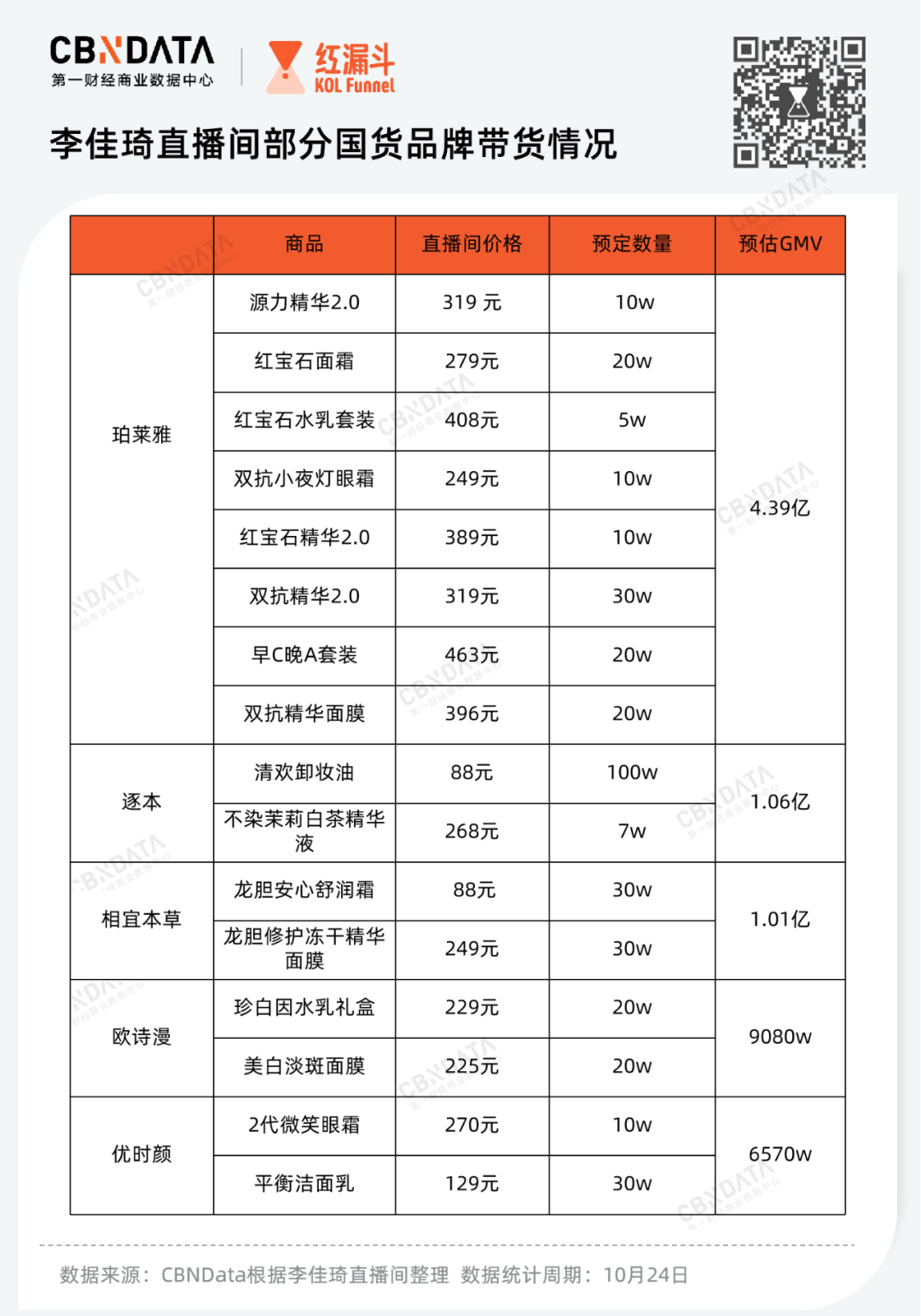 与此同时,国货品牌也不乏佼佼者。CBNData对部分国产美妆护肤品牌的带货情况整理发现,珀莱雅、逐本、相宜本草等国货品牌均获得了过亿的预定销售额,其中珀莱雅的8款产品预估销售额高达4.3亿。从备货数量来看,国货品牌大多给到李佳琦超10w以上的库存,逐本的预定量更是显示超过了100w。