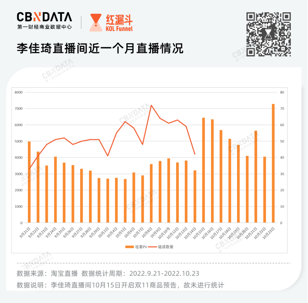 9月20日,李佳琦终于回归淘宝直播间。直播2小时,观看量超6350万,松了一口气的不止李佳琦,还有一众品牌。复播一个月以来,李佳琦虽然没能维持第一天的战绩,但也不乏亮点。例如10月3日零食节当晚场观再度突破6000万,而在10月15日正式进入双11的宣传预热期前,场观也一路水涨船高,23号观看PV超过7000万,也为双11的开启奠定了良好的基础。