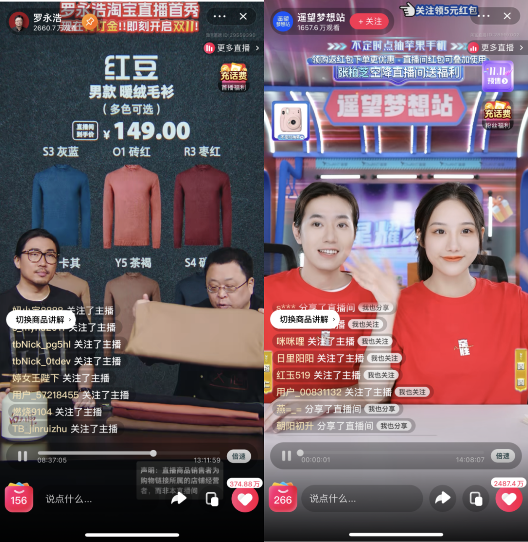 当晚,遥望旗下的张柏芝、交个朋友直播间的罗永浩均空降所属MCN直播间,最终两人分别以1600w+、2600w+的场观完成了淘宝直播的首秀。这一成绩与李佳琦相去甚远,但也算为搅动淘宝阵地的主播格局开了一个不错的头。