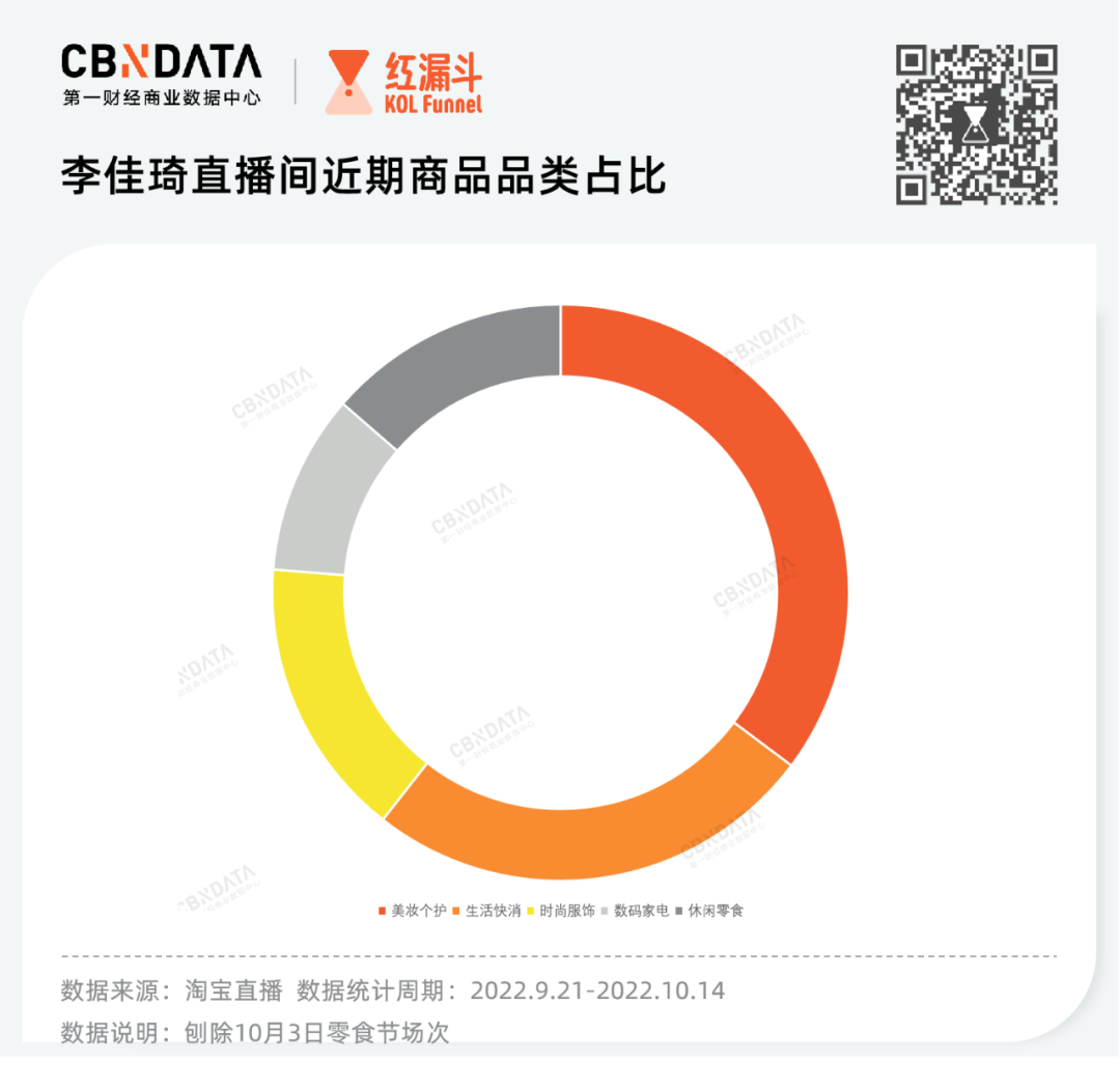 从上架商品数与品类来看,复播后李佳琦直播间的商品数量由30+一路上涨至50左右,基本恢复停播前的水平;从品类分布来看,虽然美妆个护仍然是占比最大的品类,但生活快消品类的比例明显增大,成为其直播间第二大品类。