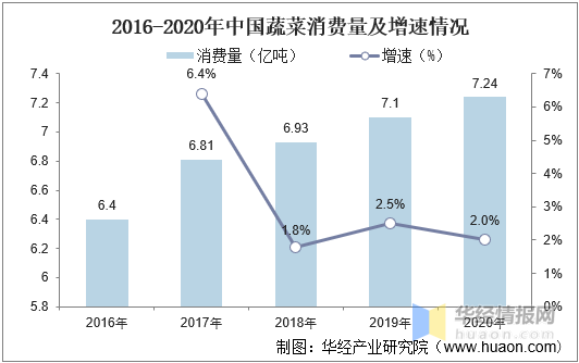 这种科技水果单品的出现也成为水果消费升级的注脚。根据本来生活,每日优鲜、京东到家等生鲜电商发布的数据显示,国内高端水果销量不断上涨,越来越多消费者对进口水果、精品水果及果蔬等青睐有加。同样的,在蔬菜产业,高端化的趋势也在凸显。根据智研咨询的中国蔬菜行业分析报告可知,目前,蔬菜生产已经成为我国种植业中仅次于粮食的第二大农作物。从蔬菜消费量情况来看,近年来,我国蔬菜消费量整体保持一个稳定上涨的趋势,由2016年的6.64亿吨增长至2020年的7.24亿吨,年复合增长率为2.19%。
