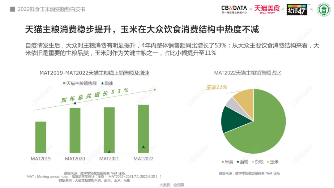 消费升级不仅发生在蔬果上,对于更传统的主粮食品,消费者也在有意识地挑选更健康和美味的产品。在天猫分类下,主粮一般指的是米类、面粉、玉米、杂粮。根据CBNData《2022鲜食玉米消费趋势白皮书》显示,在主粮销售中,米类占据大部分比重,因此我们以米类为例探讨主粮消费有哪些变化。