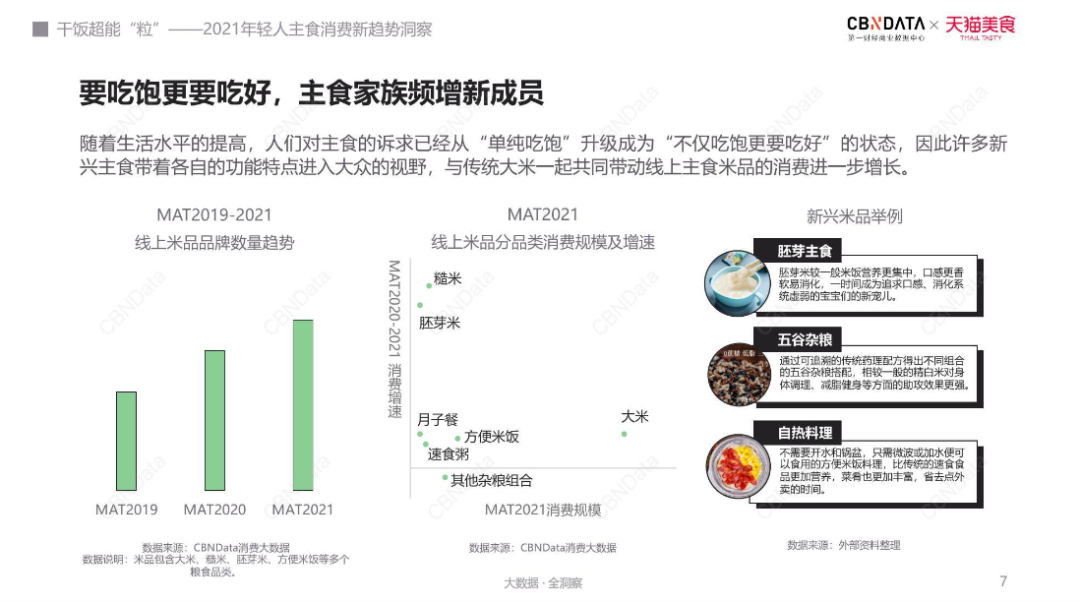 除了追求米的新鲜度,消费者也会根据家庭成员的需要或者食用条件进行挑选购买,不同群体对米类的需求不尽相同。比如儿童需要更加软糯,营养价值更高的米,年轻人需要更方便的一人食,养生一族偏爱膳食纤维更丰富的五谷杂粮。根据CBNData《2021年轻人主食消费新趋势观察》显示,米类包含大米、糙米、胚芽米、方便米饭等多个粮食品类,其中糙米和胚芽米消费增速较快。