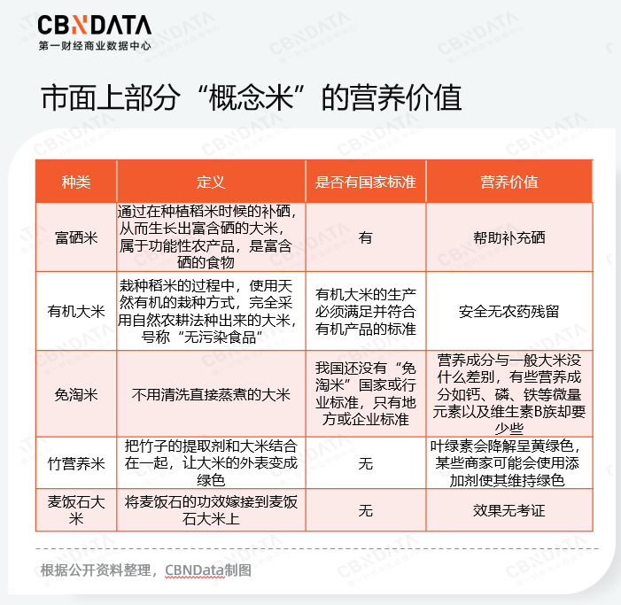 新兴主食带着特定功能走进大众生活的同时,各种打着营养旗号,号称更加优质的“概念米”也充斥在市场里,比如富硒米、有机米、免淘米、儿童米等。被贴上概念的标签后价格也一路飙升,有些比普通散装大米贵出一倍以上,那么消费者是否有必要购买?
