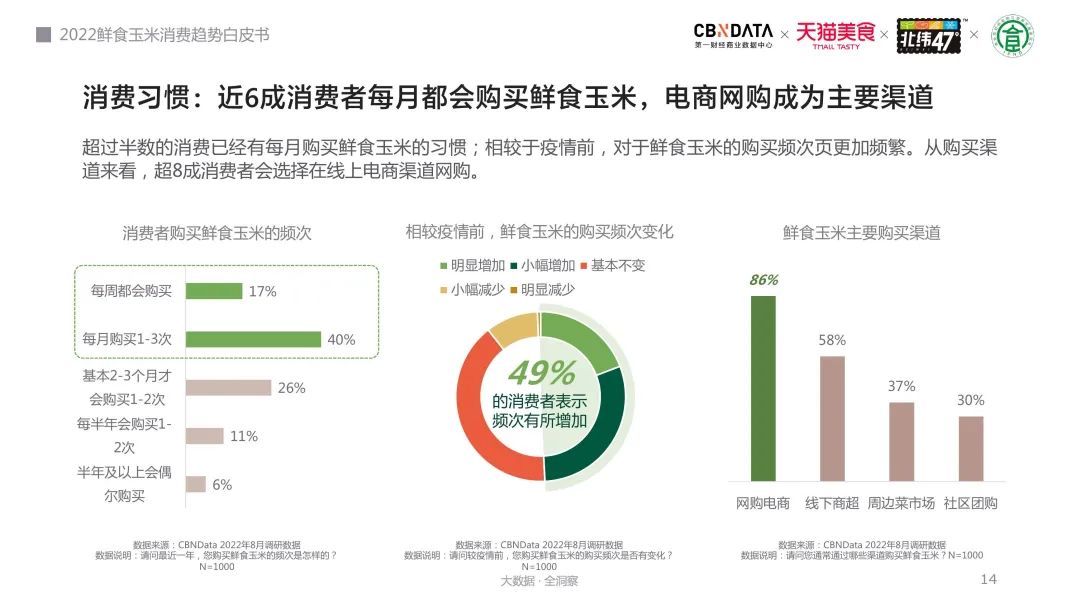 看过热闹后,话题回到我们的农产品上来。玉米之所以能掀起这么大的波澜,还是因为大众对于玉米的消耗量日益增大,人们对于玉米的价格亦或是种类的关注度都在提升。如今玉米不仅是煲汤、炒菜时候的配料,更是健身人士的轻食,宝宝餐的常客,从传统餐桌到办公健身,玉米的食用场景正发生着巨大的改变。在需求细分下,消费者也在不断寻找更便利和口感更佳的玉米种类,其中鲜食玉米逐渐受到大家的喜爱,根据CBNData《2022鲜食玉米消费趋势白皮书》显示,鲜食玉米的销售在食用玉米中的占比不断提升,80%的消费者选择在线上电商渠道网购。