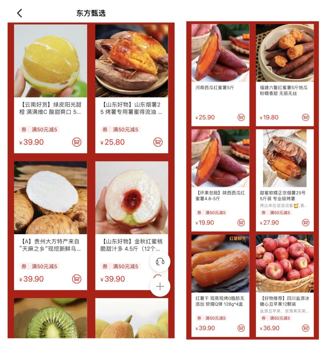 不过经过这次玉米事件,东方甄选目前已经下架了相关产品。打开东方甄选APP的购物界面可以看到,目前东方甄选时令水果品类共有47个SKU,商品分别按照【产地好物】,【山货推荐】,【东方好物】,【稀有好物】进行分类。从价格上看,价格最贵的是129元/4斤的新疆香妃海棠果礼盒装,最便宜的是9.9元11袋的新疆灰枣,大多数单品在30-50元左右,价格相对比较友好。值得注意的是,东方甄选把紫薯、贝贝南瓜、蜜薯也划分在时令水果,且单是蜜薯品类就占了6个SKU,或是来自不同产地,或是通过脱水晒干、真空包装呈现不同形态。