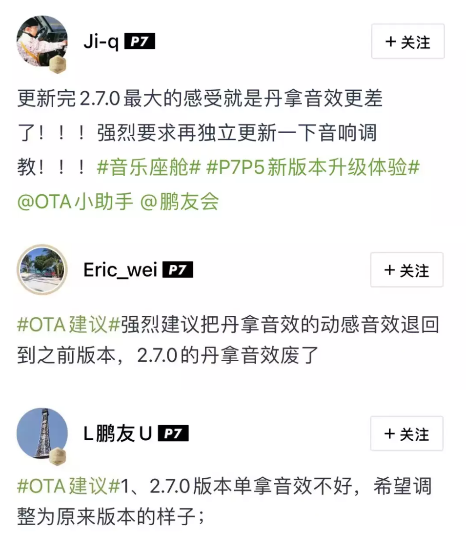 今年1月,小鹏P7进行OTA升级,更改了丹拿音响效果。这次升级被王超肃评价为“改得一塌糊涂”:“举个例子,同一首歌,同等音量下,升级完后声音明显变得很轻。而且,车里部分音响单元,没有声音了。”