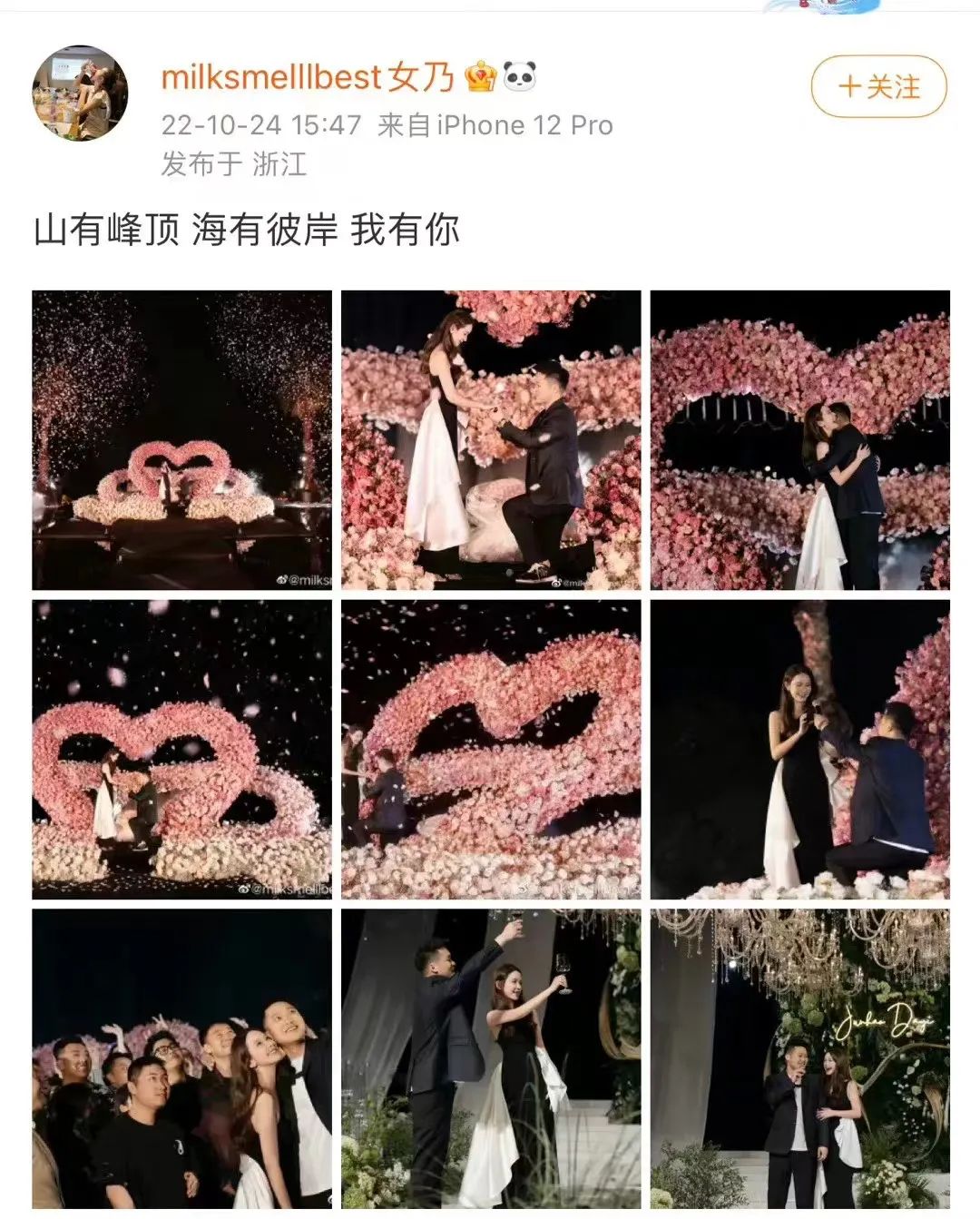 10月24日,张大奕在微博上发布了一组求婚现场的照片,并且配文“山有封顶 海有彼岸 我有你”。从照片来看,二人在巨大的心形玫瑰前面,男方单膝下跪为她戴上戒指。