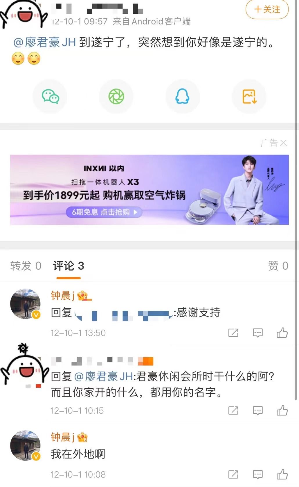 事实上,在社交软件的资料介绍中,廖君豪是一名不折不扣的“90后”,出生于1993年,今年29岁,曾用微博用户名为“廖君豪JH”,如今为“钟晨j”。