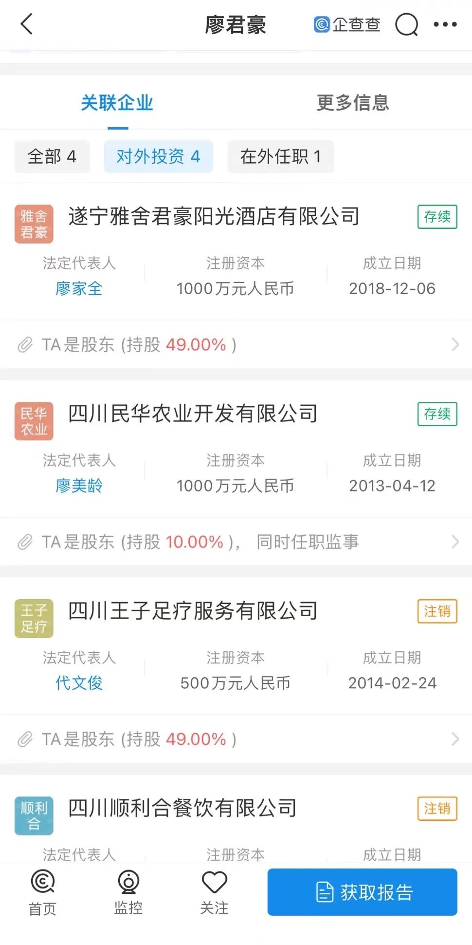 据企查查显示,廖君豪为遂宁雅舍君豪阳光酒店有限公司、四川民华农业开发有限公司、四川王子足疗服务有限公司、四川顺利合餐饮有限公司的股东。