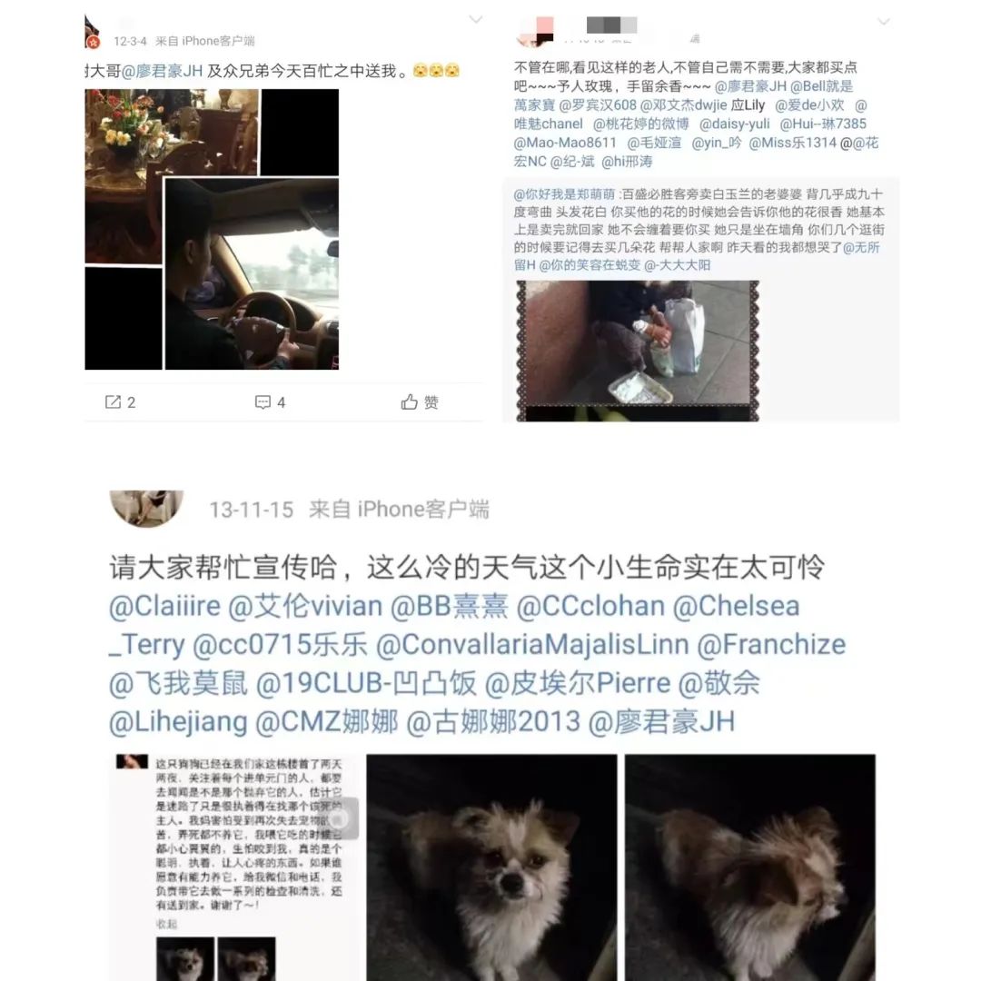 在一名与他互相关注的好友微博中,2011年-2013年间,廖君豪的名字曾频繁出现,包括庆祝生日、好友聚会等。在他的微博中,廖君豪本人虽然是一名富二代,也曾亲自开豪车去送好友。同期,在@廖君豪JH的微博中,也有一些如帮助卖花婆婆、关爱流浪狗的博文。