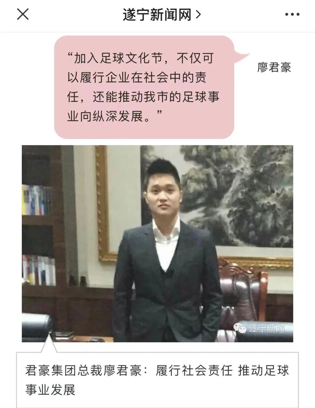 此外,2015年,据“遂宁新闻网”报道,君豪建设集团还对遂宁市本地的遂中实验学校足球队进行冠名。