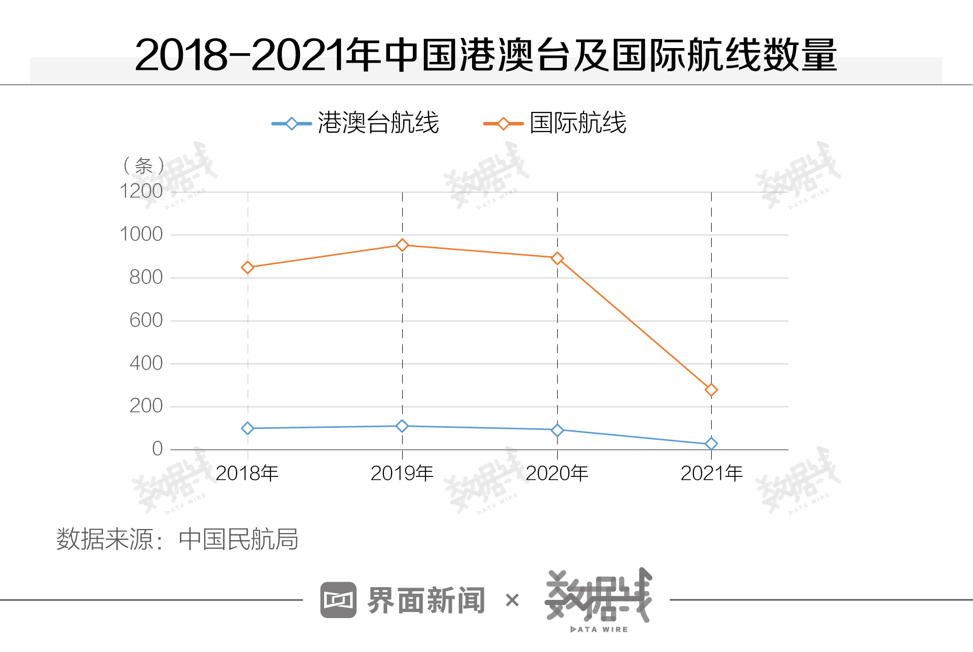 据界面数据统计,自2020年以来,我国港澳台航线和国际航线数量均出现大幅缩减。与2019年相比,2021年港澳台航线减少86条,下滑77.48%;国际航线减少674条,下滑70.72%。