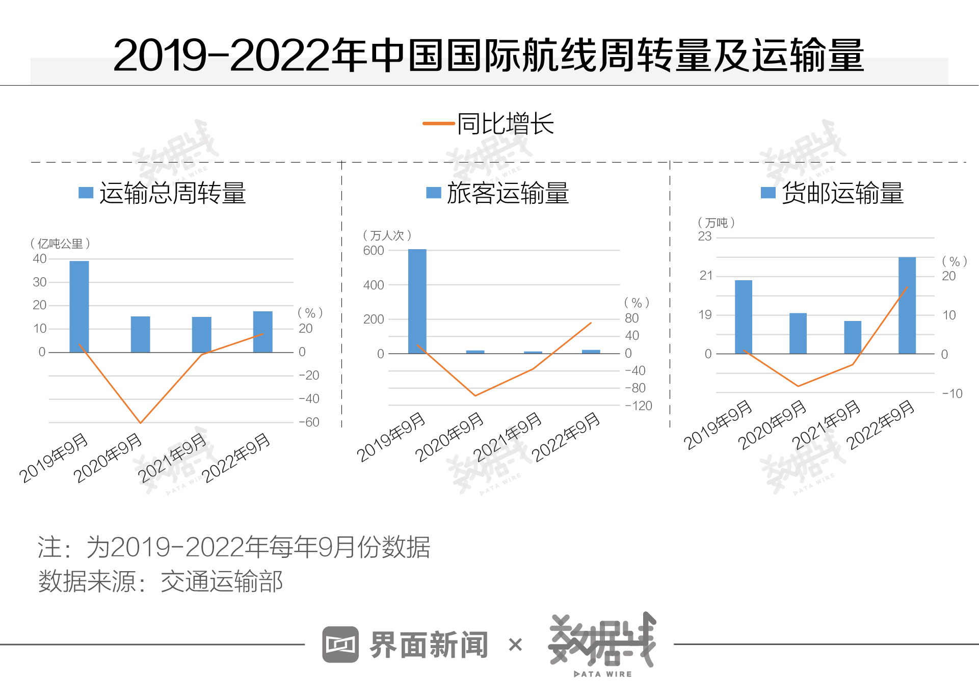 由此来看,今年9月,我国国际航线运输总周转量已恢复至2019年同期近5成;旅客运输量恢复至2019年同期不到1成;货邮运输量则比2019年同期要多5.8个百分点。