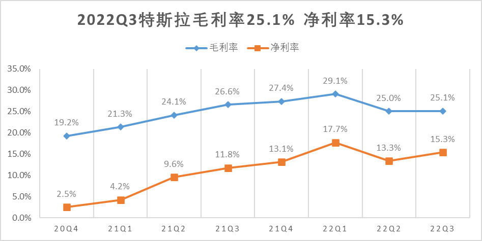 受到原材料价格上涨的影响,特斯拉营业成本同比增长59.2%,高于55.9%的营收增速,导致毛利率较2021年3季度下降1.5个百分点至25.1%。