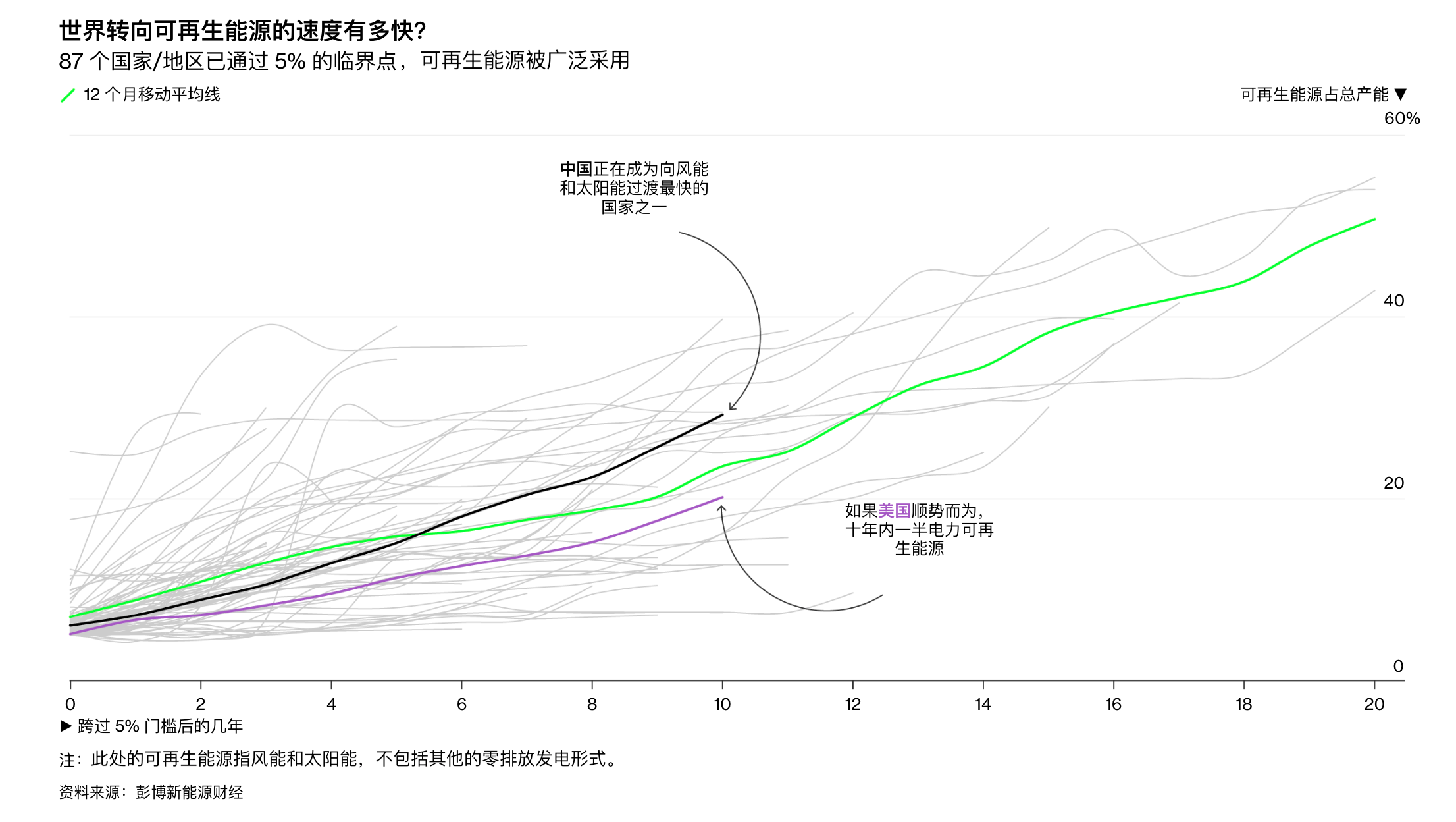 彭博新能源财经认为,全球生产和使用电力的方式正在经历一系列转变。这些转变同时发生,将最终影响全球气候变化的进程。不同的技术也共同构成了建立气候安全型能源系统的早期临界点。全球何时能够成功跨越这一门槛,是当前所面临的最大问题。