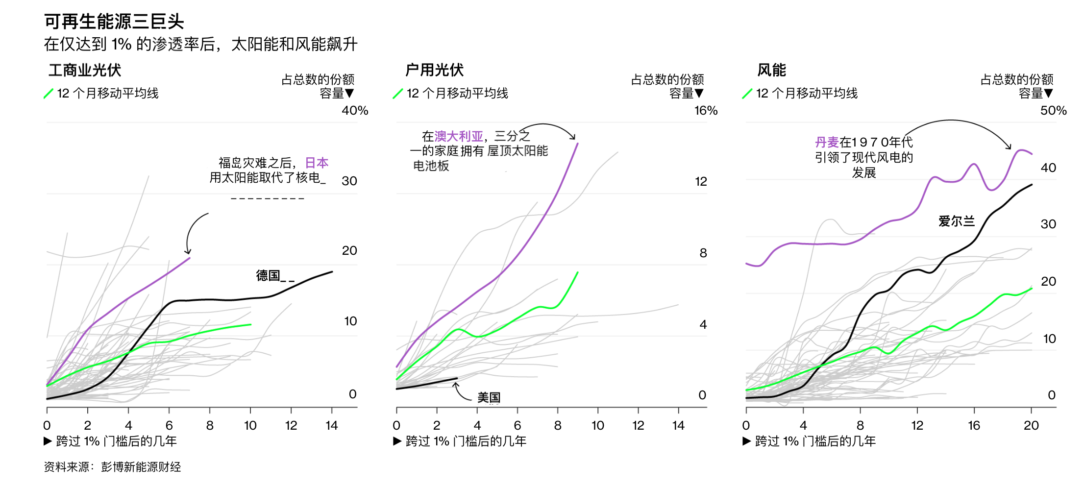 彭博新能源财经统计了三种主要可再生能源的渗透曲线,即工商业光伏、户用光伏和风能。数据显示,达到1%的渗透率门槛后,光伏和风能的发展均显示出飙升趋势。