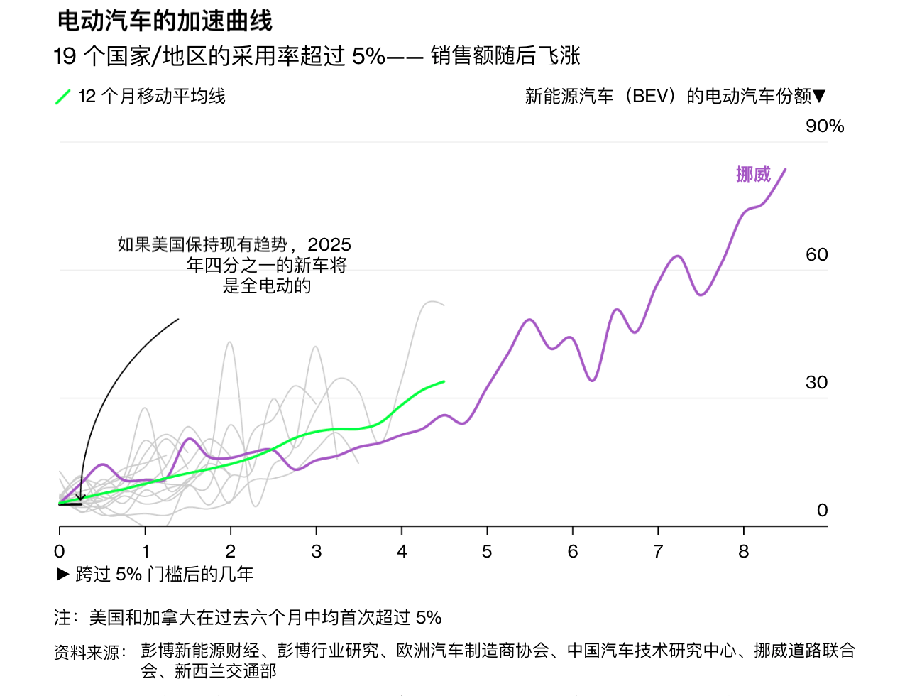 在过去6个月,美国的电动汽车占新能销售的比重首次超过5%,成为第19个超过该临界点的国家。遵循另外18个国家的趋势,预计到2025年底,美国电动汽车的渗透率将增至25%。