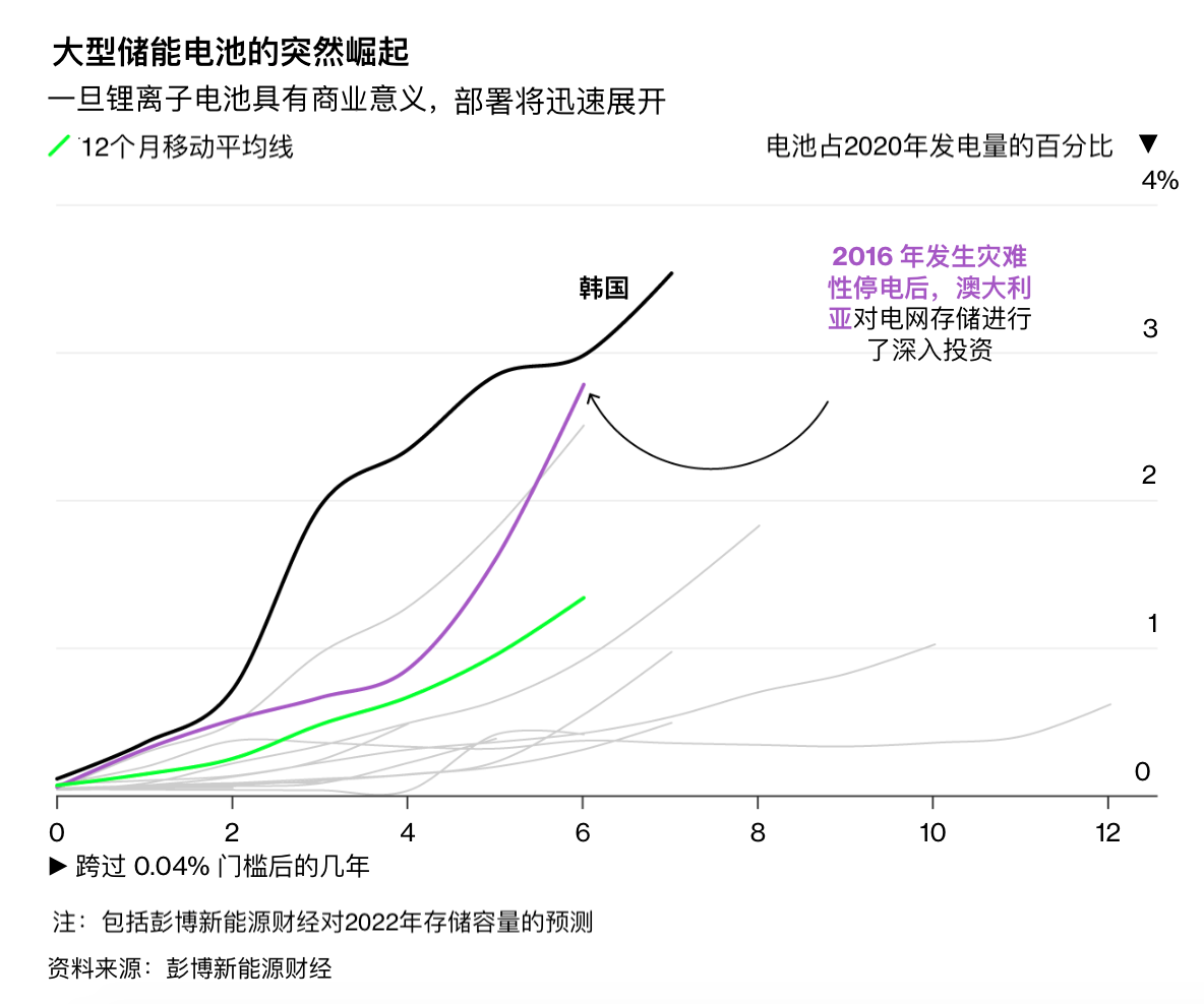 韩国是目前储能电池渗透率增长最快的国家。澳大利亚超过临界点已有6年,在2016年发生灾难性停电后,澳大利亚就对电网储能进行了大规模投资。