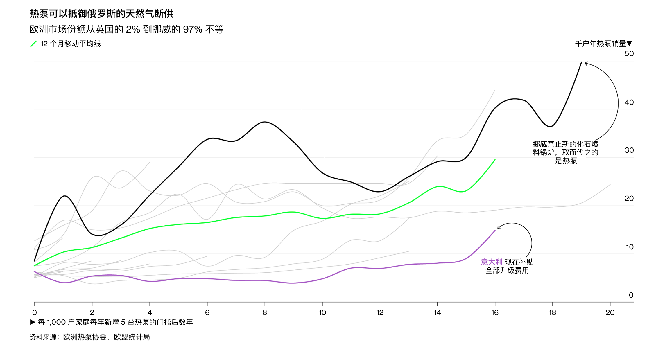 据彭博新能源财经数据,挪威是欧洲国家中热泵市场份额最高的国家,达到了97%。该国已禁止新的化石燃料锅炉,并由热泵取而代之。