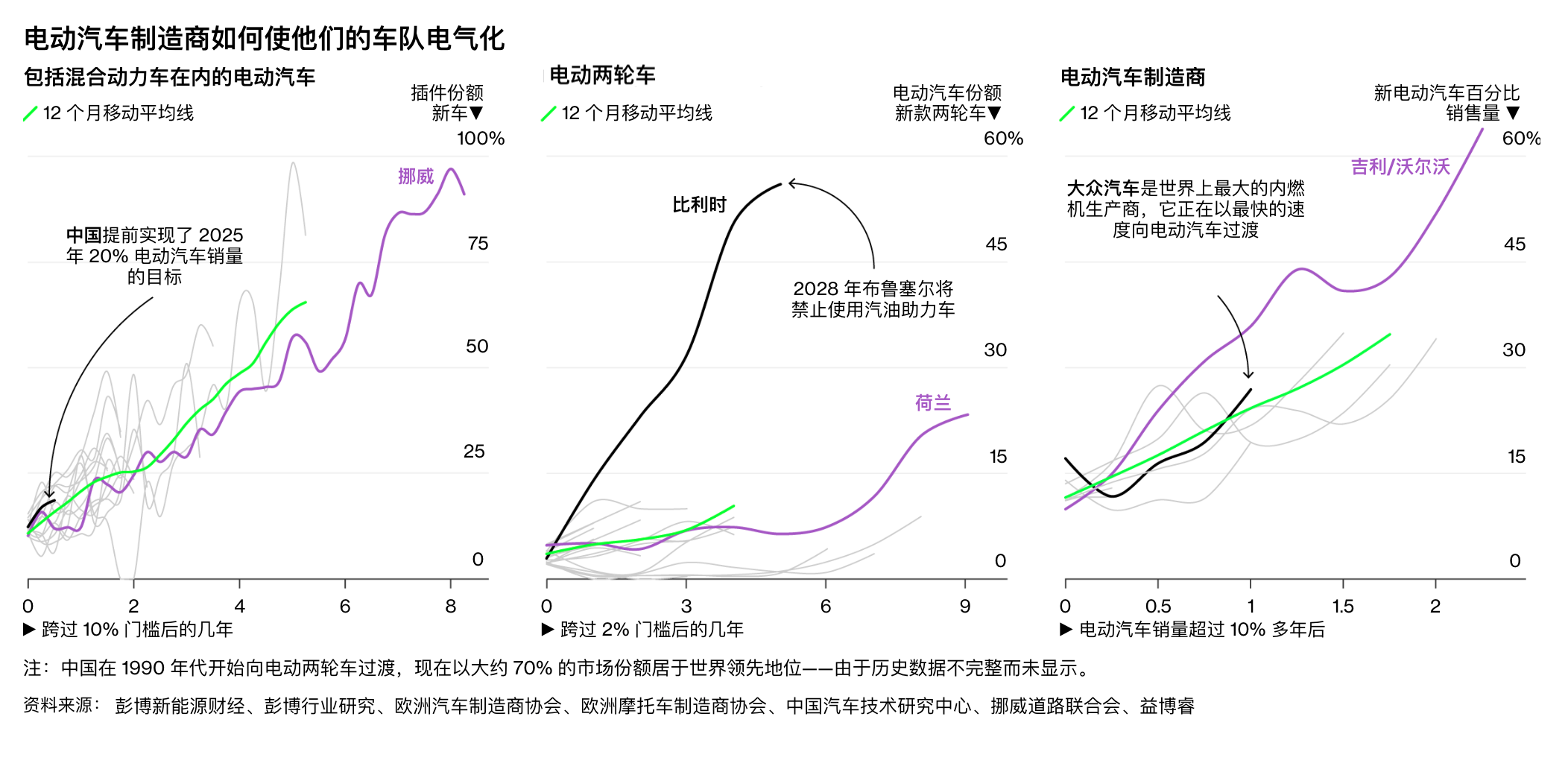 对于汽车制造商而言,临界点的概念也同样适用,彭博新能源财经将数值定为10%。超过这一临界点后,汽车制造商的电动汽车产量便会加速提升。