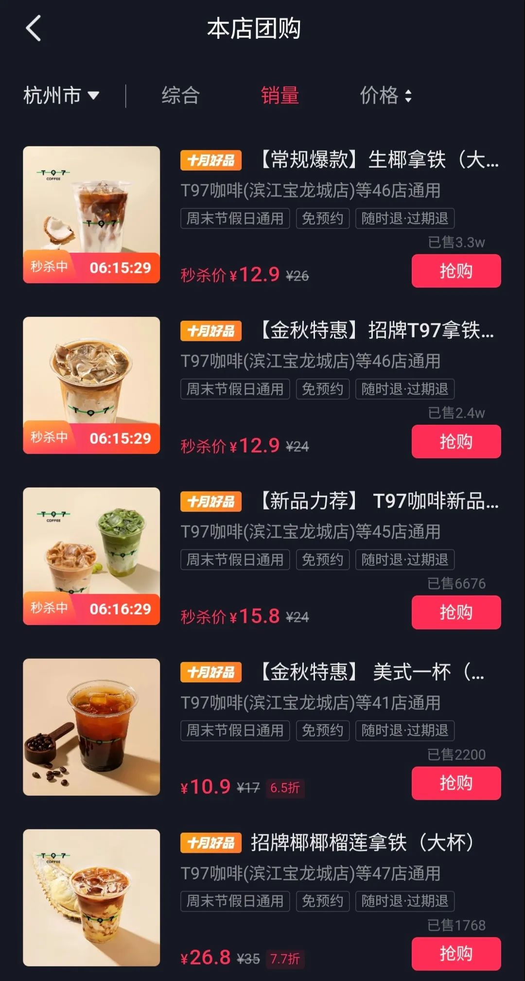 或许是受到门店数量的限制,T97咖啡的直播间虽然每天观看人数达到几百万,但截至目前真正卖出去的团购券只有几万份。销量第一的“生椰拿铁”,团购券销量也只有3万多份。
