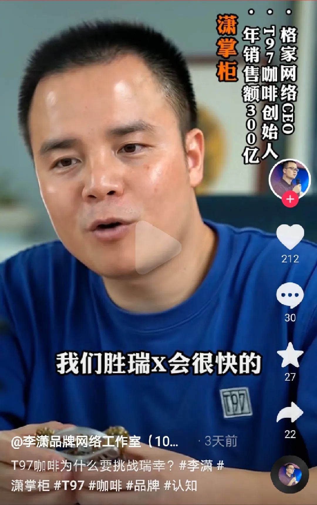 直播间走红后,T97董事长李潇也在网络上高调起来,多次在短视频中表示将“超越瑞幸”。李潇在朋友圈的个性签名,也改为“一年内将开出1001家T97咖啡连锁店”。
