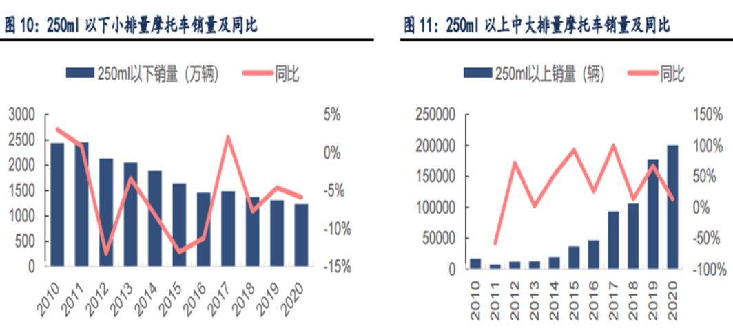 回溯历史来看,过去的主流车型从125ml 排量逐步过渡到 150ml,目前 250ml以上中大排量休闲娱乐为主的摩托车型进入快速增长阶段,预计增长空间较大。