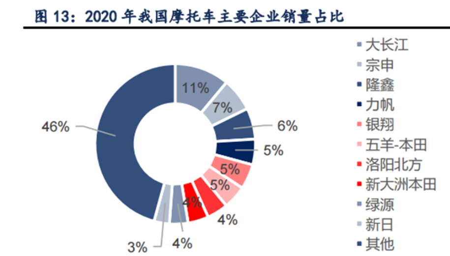 目前国内摩托车行业 CR15约占67%左右,2020年销量前10名企业分别是大长江、宗申、隆鑫、力帆、银翔、五羊-本田、洛阳北方、新大洲本田、绿源、新日,分别销售 188.73万辆、114.26 万辆、 107.42 万辆、88.22 万辆、86.16 万辆、81.08 万辆、72.73 万辆、70.68 万辆、63.76万辆、52.95万辆,CR10 约为 55%。我国目前共有 100家左右摩托车企业,主要分布在广东、江苏、 浙江和重庆,四个省份的摩托车企业数量占比超 60%。