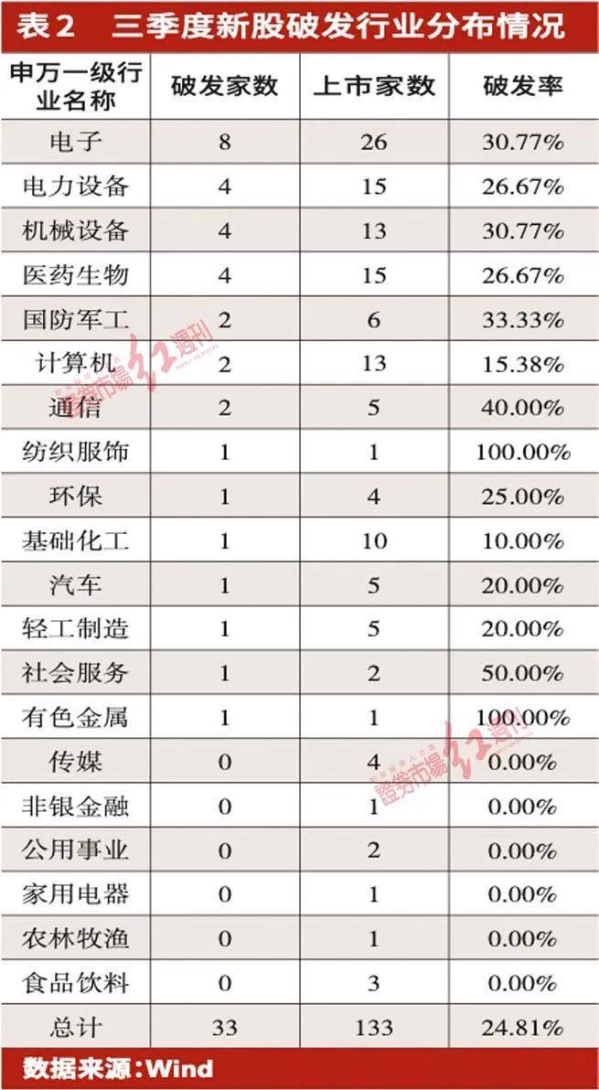 按新股发行行业分布统计,三季度,以申万一级行业划分,电子、电力设备、医药生物、机械设备、计算机、基础化工行业新股上市家数居于前列,分别为26家、15家、15家、13家、13家、10家(详见表2)。上述新股发行数量较多的行业中,破发率较高的主要有电子、电力设备、机械设备、医药生物,破发率均超过26%,呈现出较强的行业相关性。