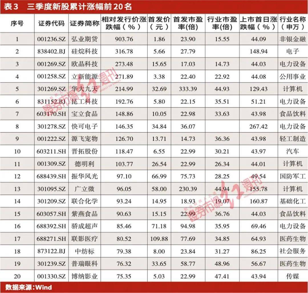 此外,新股累计涨幅也呈现出行业相关特性,据《红周刊》统计,三季度上市首发至今(截至10月21日)涨幅排名前20的新股主要集中在消费类、医药生物、电力设备、计算机等行业(详见表3)。