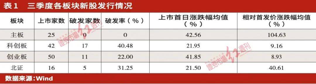 据《红周刊》统计,三季度共有133只新股上市,其中33只新股上市首日破发,破发率为24.81%,新股上市首日破发率较高。不过,各板块的破发情况却差别较大,其中沪深主板新股发行数量为25家,但无一家出现首日破发现象,且上市首日的平均涨幅达42.56%,在各板块中涨幅居首(详见表1)。