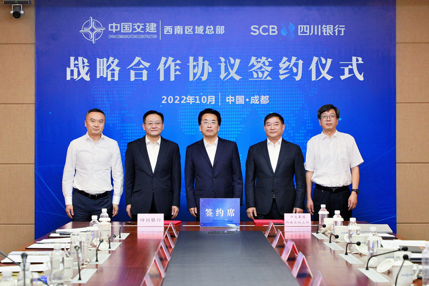 刘先鹏与杨朝晖分别代表双方签署《中国交通建设股份有限公司西南区域总部与四川银行股份有限公司战略合作协议》。根据协议,四川银行将中交集团西南区域总部作为重要的长期全面合作伙伴,为其提供贯穿业务全周期的一揽子综合化金融服务,包括但不限于以各类保函为代表的全建设链条下的供应链服务以及农民工的民生保障金融服务等。