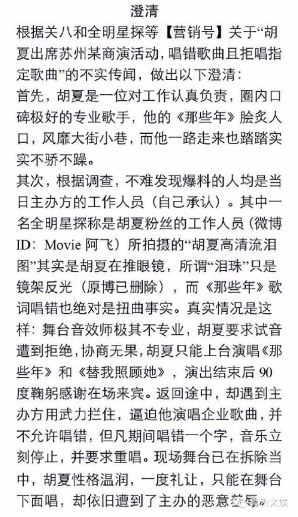 随后胡夏的粉丝后援会发文澄清,胡夏没哭,主办方态度恶劣不讲道理等。