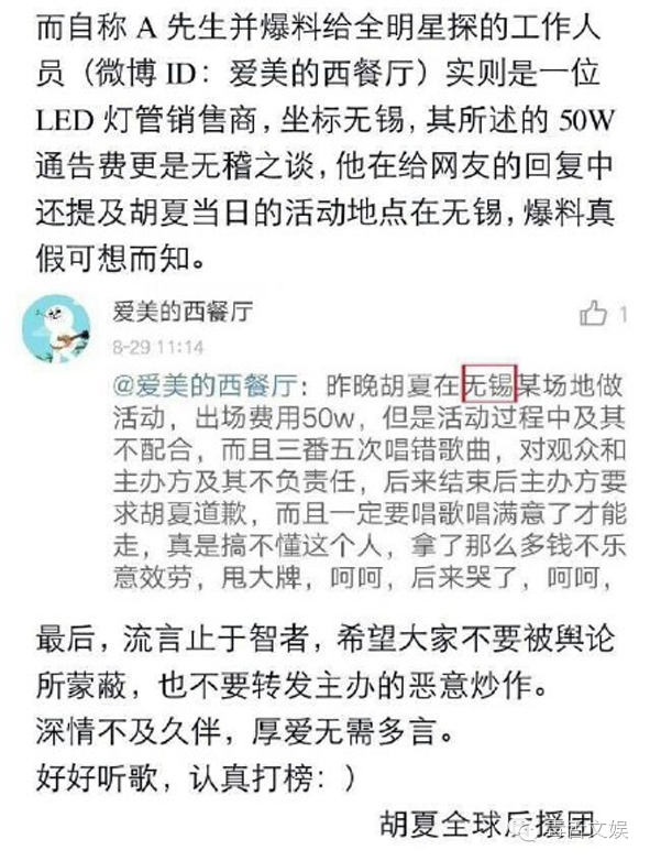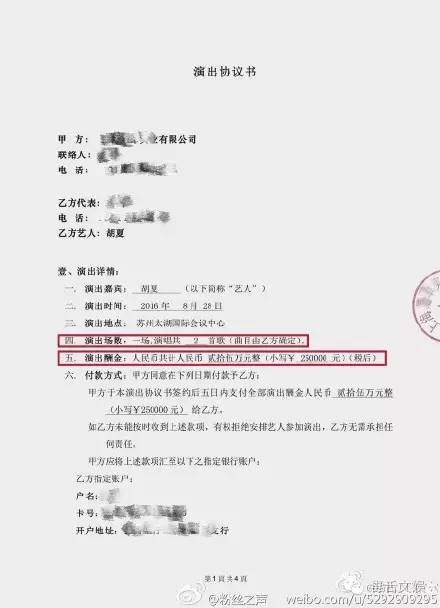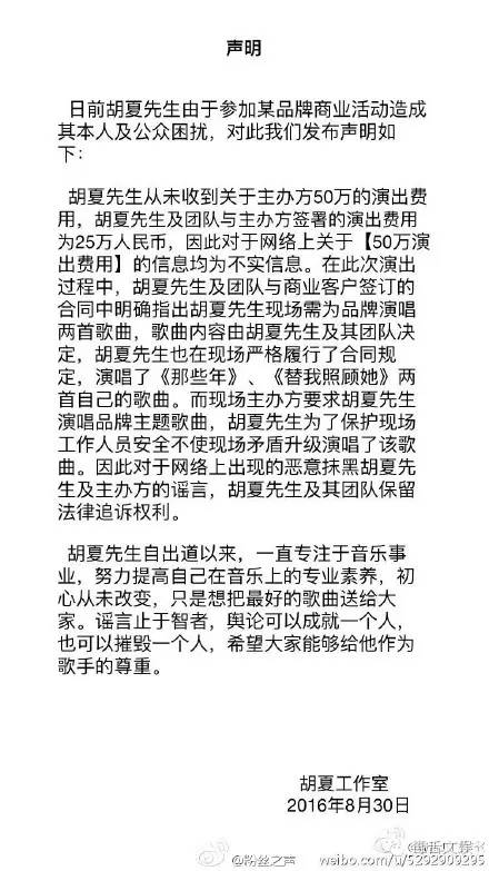胡夏工作室也发出了声明,声称关于50万演出费不属实,而且合同所签署的规定也都完成,品牌主题歌曲是现场额外要求的,胡夏为了不使矛盾升级也同意演唱。