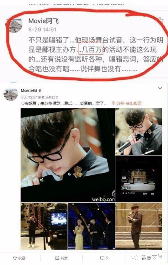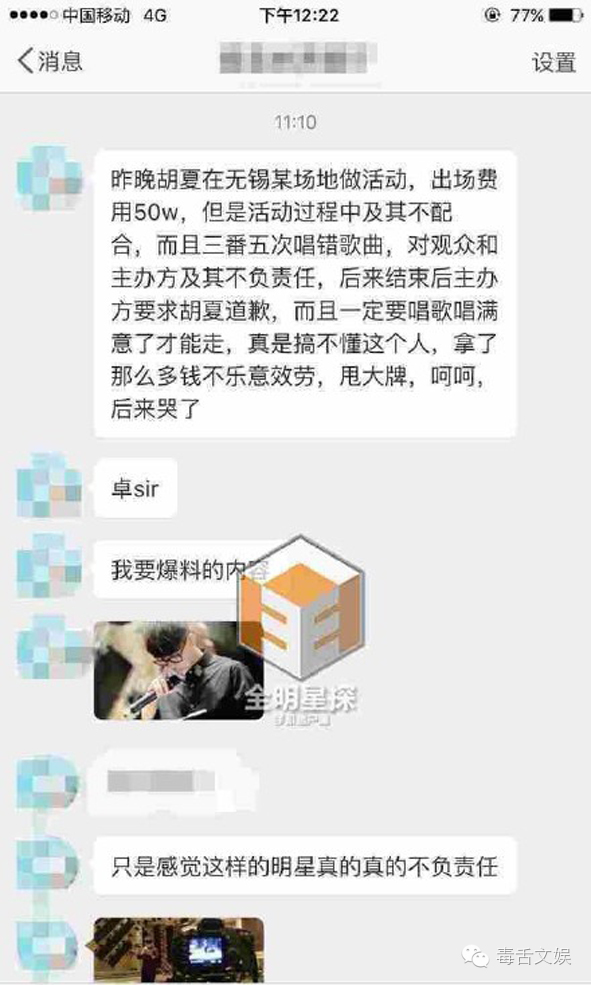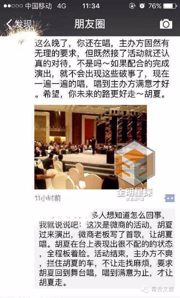 爆料网友称歌手胡夏日前在出席某商业活动时,因频出错被主办方拦下重返舞台直到唱好为止。