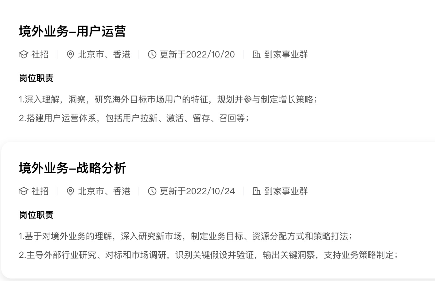 值得注意的是,此次招聘的岗位大多属于外卖业务所在的到家事业群。10月初,晚点LatePost曾报道称美团正筹备其国际化业务,将首先在中国香港地区试点外卖业务,该业务由仇广宇负责,并向美团高级副总裁、到家事业群总裁王莆中汇报。