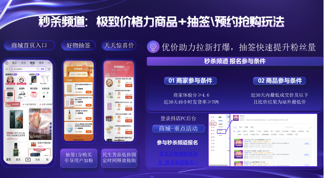 此外,抖音还将在不同链路均为商家提供激励政策,打爆流量,并以巨量千川组合资源包+场景解决方案、超额投放福利会场、新客百亿扶持会场、品牌推广激励会场等重磅场景玩法,助力商家流量扩大、生意爆发、效率跃升。
