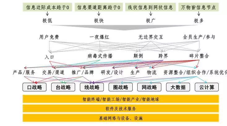 互联网时代是通过“信息边际成本趋于零(极低),信息渠道距离趋于零(极快),线状信息到网状信息(极广),万物皆信息节点(极多)”,从而产生“入口、病毒式传播、颠倒、跨界、碎片整合”五大基本机理来改变商业世界的。