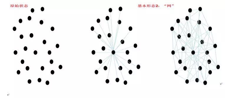 将原来混乱的世界通过互联网连接成一张网,无论是通过一个中心的端口还是没有中心的连接,都会形成一个网,这就是网模式。如下图: