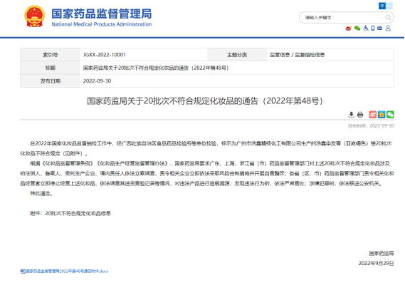 然而就在近日,新华网发布一则消息《这些化妆品,不合规!你也许正在用》,其报道在2022年国家化妆品监督抽检工作中,经广西壮族自治区食品药品检验所等单位检验,标称为浩鑫染发膏(亚麻褐色)、卡姿兰美颜大咖奢护BB霜、安热沙水能户外清透防晒乳等20批次化妆品不符合规定。