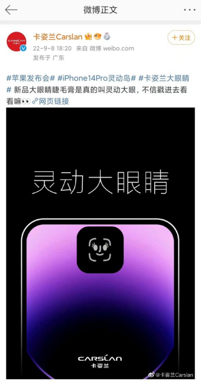 而在此之前,卡姿兰也一直在公众面前强化“卡姿兰大眼睛”这一品牌印象。比如今年的苹果发布会,卡姿兰蹭起了iPhone14Pro灵动岛的热度,为产品宣传“灵动大眼”。