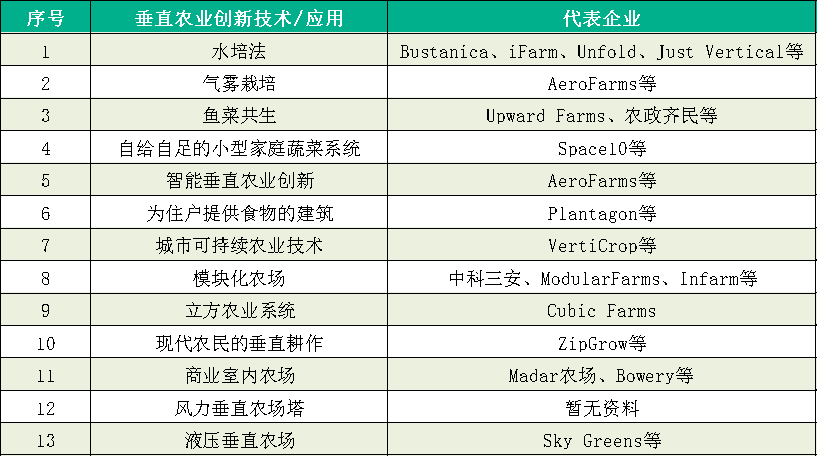 图:垂直农业的13种创新技术及其应用,数据来源:中农智联