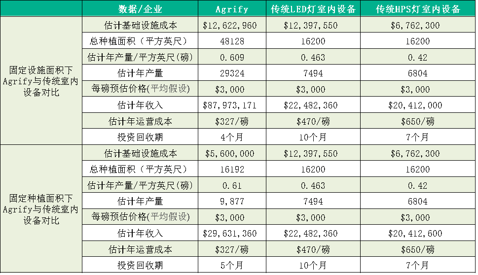图:Agrify所用的垂直种植单元技术与LED灯、高压钠灯( HPS)的传统室内种植室设备进行对比情况一览,数据来源:Agrify招股书,天风证券研究所
