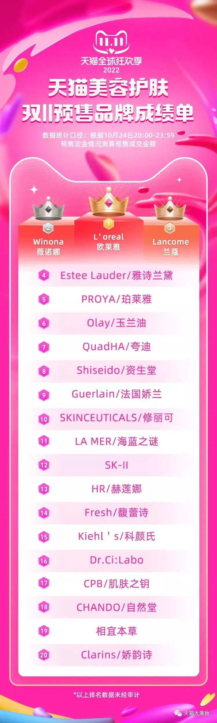 从具体品类来看,在护肤板块,欧莱雅、兰蔻和薇诺娜位居“天猫美容护肤双11预售品牌成绩单”TOP3,雅诗兰黛、珀莱雅紧随其后,相宜本草、自然堂同样跻身护肤板块前二十。
